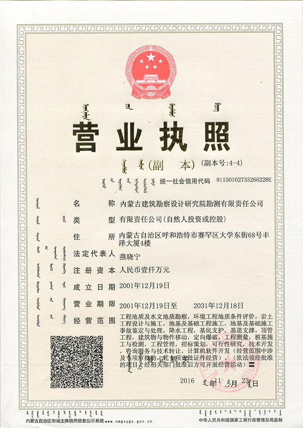 - 內蒙古建筑勘察設計研究院勘測有限責任公司,是全國首家完成 轉企建制的省級建筑勘察設計單位。公司前身為內蒙古建筑勘察 設計研究院勘測分院, 成立于1954年 ,經過六十多年的發展, 現已成為全區技術力量雄厚、專業設置齊全的集巖土工程勘察 、 設計、治理、檢測、監理、咨詢、水文地質勘查、工程測量、科 研為一體的綜合性企業 ... ... [查看詳情]